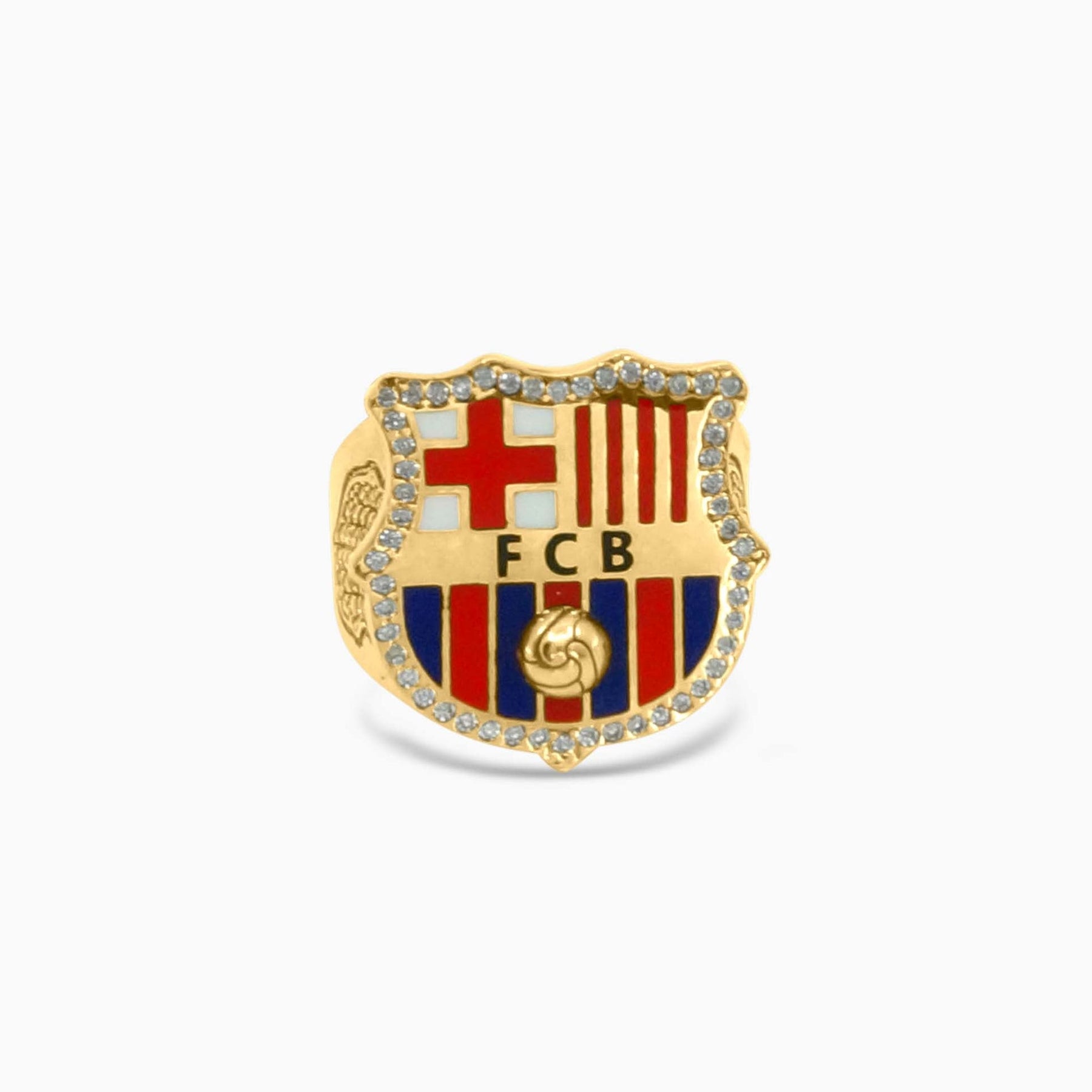 Anillo de oro 10K con diseño del escudo F.C. Barcelona, trabajado en esmalte rojo, azul y blanco con detalles en pavé. Representa orgullo, pasión y lealtad al equipo, combinando elegancia y espíritu deportivo en una joya única hecha para verdaderos fanáticos.